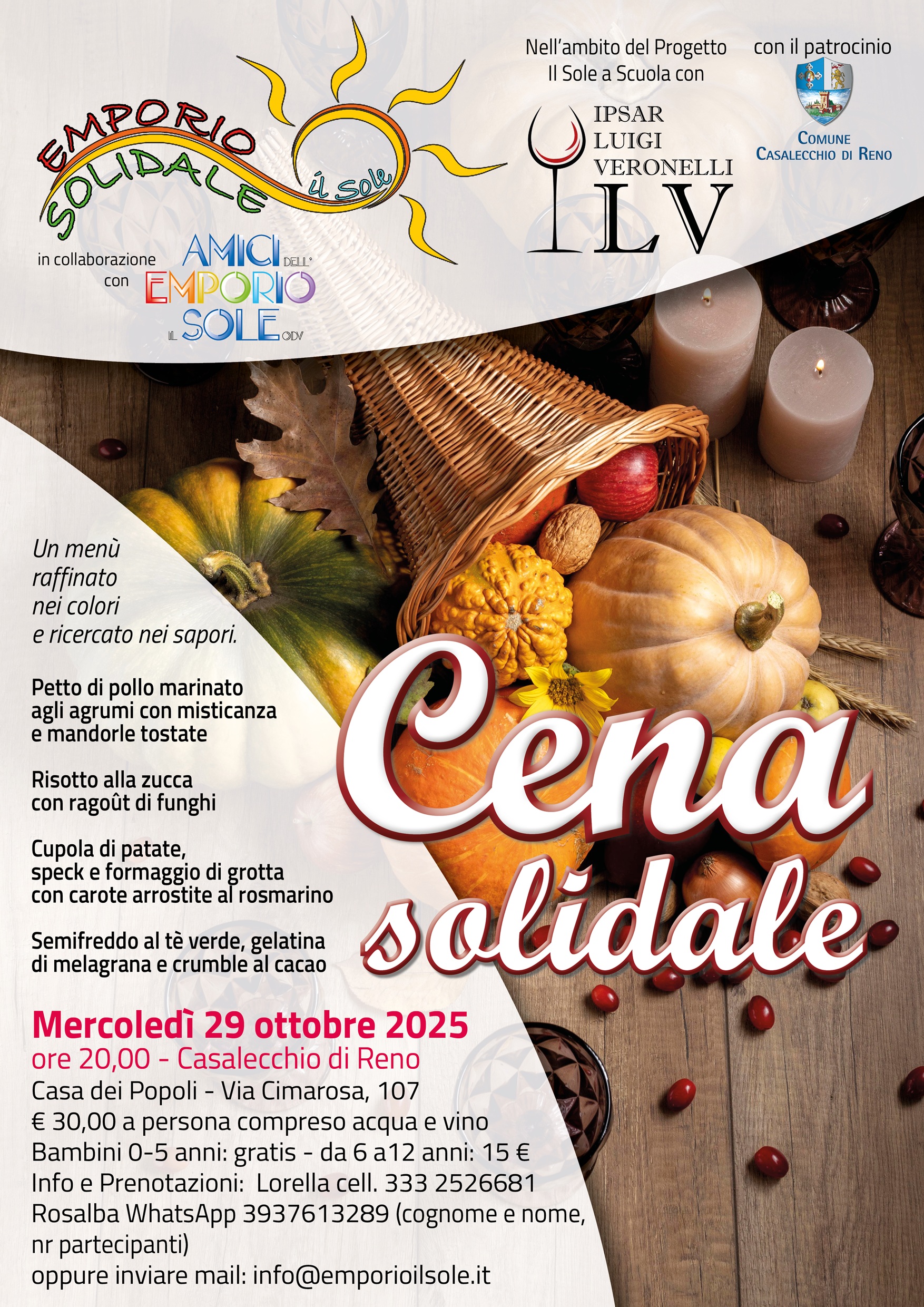 Mercoledì 29 ottobre 2025 Emporio Solidale Il Sole e IPSAR Veronelli invitano a una cena solidale per raccogliere fondi.